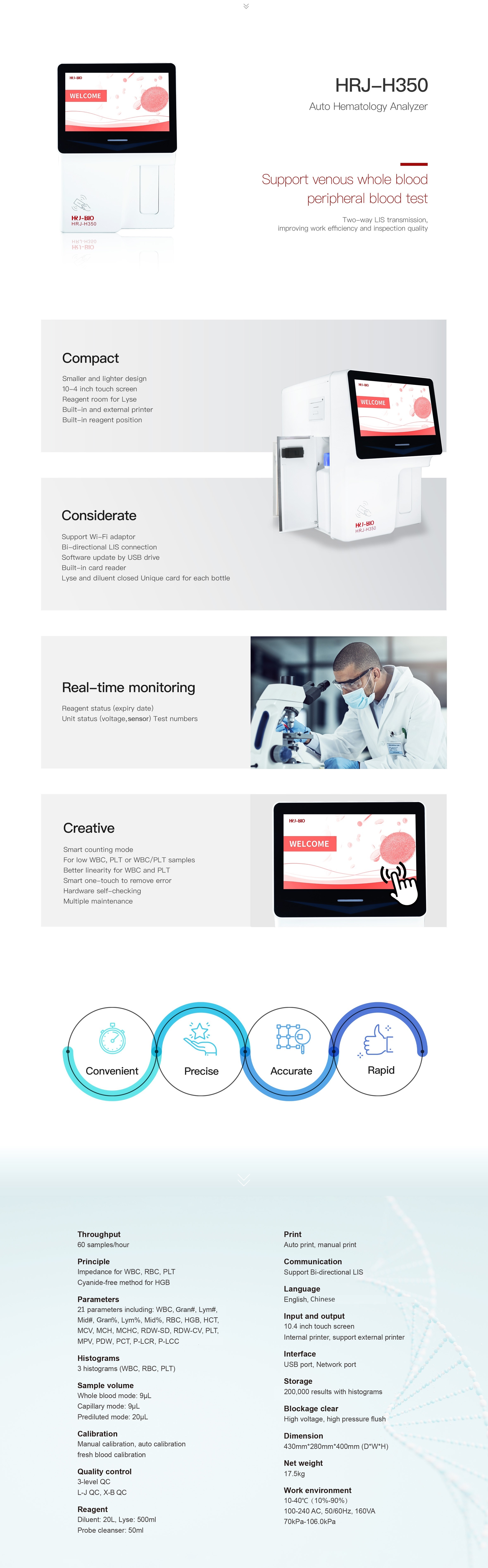 HRJ-H350 adopts impedance method for WBC, RBC and PLT test, cyanide free colorimetry for HGB test